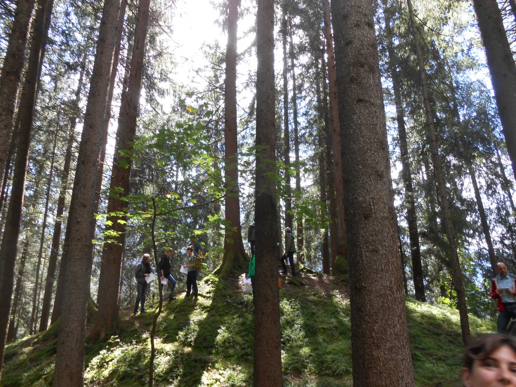 A protection forest stand dominated by mixed aged Norway Spruce (Picea abies) that is managed to reduce avalanche risk for the town.